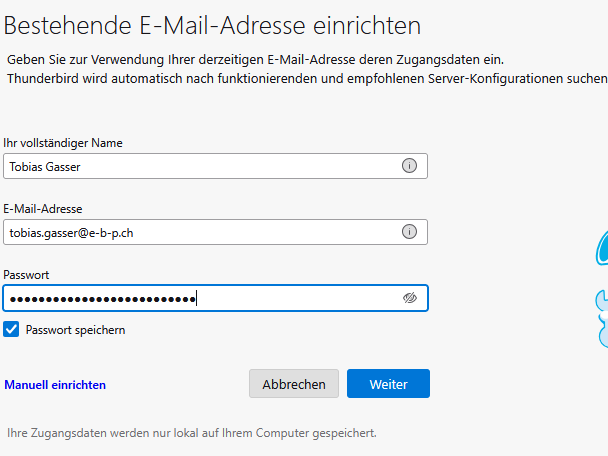 Thunderbird erkennt die notwendigen Daten automatisch weitgehende korrekt.