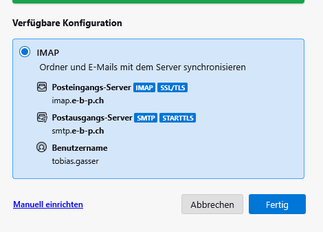 | Deshalb NICHT auf Fertig klicken, sondern auf Manuell einrichten. |